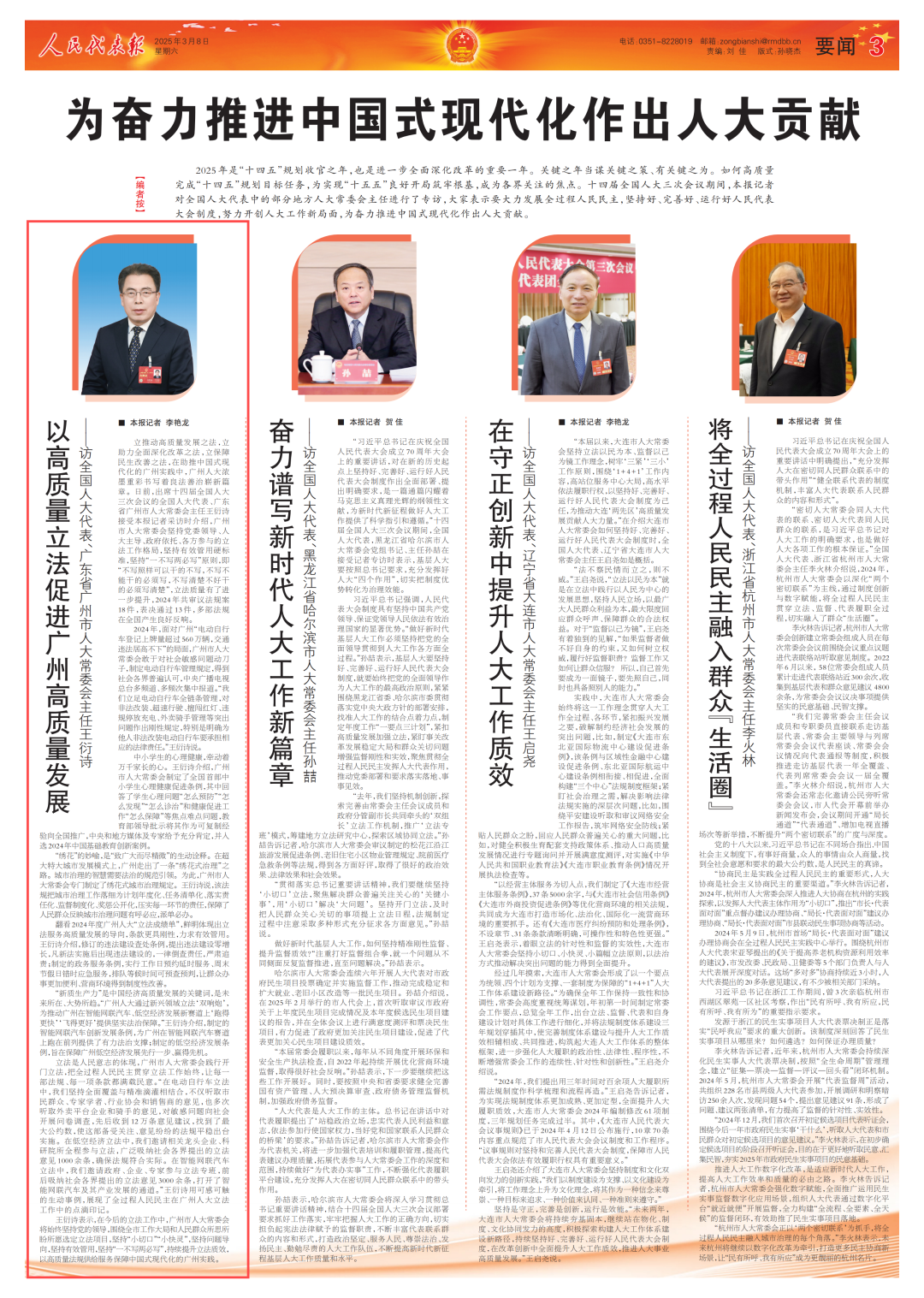 立推动高质量发展之法,立助力全面深化改革之法,立保障民生改善之法,在助推中国式现代化的广州实践中,广州人大浓墨重彩书写着良法善治崭新篇章。日前,出席十四届全国人大三次会议的全国人大代表、广东省广州市人大常委会主任王衍诗接受本报记者采访时介绍,广州市人大常委会坚持党委领导、人大主导、政府依托、各方参与的立法工作格局,坚持有效管用硬标准,坚持“一不写两必写”原则,即“不写照样可以干的不写,不写不能干的必须写,不写清楚不好干的必须写清楚”,立法质量有了进一步提升,2024年共审议法规案18件,表决通过13件,多部法规在全国产生良好反响。 2024年,面对广州“电动自行车登记上牌量超过560万辆,交通违法居高不下”的局面,广州市人大常委会敢于对社会敏感问题动刀子,制定电动自行车管理规定,得到社会各界普遍认可,中央广播电视总台多频道、多频次集中报道。“我们立足电动自行车全链条管理,对非法改装、超速行驶、擅闯红灯、违规停放充电、外卖骑手管理等突出问题作出刚性规定,特别是明确为他人非法改装电动自行车要承担相应的法律责任。”王衍诗说。 中小学生的心理健康,牵动着万千家长的心。王衍诗介绍,广州市人大常委会制定了全国首部中小学生心理健康促进条例,其中回答了学生心理问题“怎么预防”“怎么发现”“怎么诊治”和健康促进工作“怎么保障”等焦点难点问题,教育部领导批示将其作为可复制经验向全国推广,中央和地方媒体及专家给予充分肯定,并入选2024年中国基础教育创新案例。 “绣花”的妙喻,是“致广大而尽精微”的生动诠释。在超大特大城市发展模式上,广州走出了一条“绣花式治理”之路。城市治理的智慧需要法治的规范引领。为此,广州市人大常委会专门制定了绣花式城市治理规定。王衍诗说,该法规把城市治理工作落细为计划年度化、任务清单化、落实责任化、监督制度化、奖惩公开化,压实每一环节的责任,保障了人民群众反映城市治理问题有呼必应,派单必办。 翻看2024年度广州人大“立法成绩单”,鲜明体现出立法服务高质量发展的导向,条款更具刚性,力求有效管用。王衍诗介绍,修订的违法建设查处条例,提出违法建设零增长,凡新法实施后出现违法建设的,一律倒查责任,严肃追责;制定的政务服务条例,实行工作日预约延时服务、周末节假日错时应急服务,排队等候时间可预查预判,让群众办事更加便利、营商环境得到制度性改善。 “新质生产力”是中国经济高质量发展的关键词,是未来所在、大势所趋。“广州人大通过新兴领域立法‘双响炮’,为推动广州在智能网联汽车、低空经济发展新赛道上‘跑得更快’‘飞得更好’提供坚实法治保障。”王衍诗介绍,制定的智能网联汽车创新发展条例,为广州在智能网联汽车赛道上跑在前列提供了有力法治支撑;制定的低空经济发展条例,旨在保障广州低空经济发展先行一步、赢得先机。 立法是人民意志的体现,广州市人大常委会践行开门立法,把全过程人民民主贯穿立法工作始终,让每一部法规、每一项条款都满载民意。“在电动自行车立法中,我们坚持全面覆盖与精准滴灌相结合,不仅听取市民群众、专家学者、行业协会和销售商的意见,也多次听取外卖平台企业和骑手的意见,对敏感问题向社会开展问卷调查,先后收到12万条意见建议,找到了最大公约数,使这部备受关注、意见纷纷的法规平稳出台实施。在低空经济立法中,我们邀请相关龙头企业、科研院所全程参与立法,广泛吸纳社会各界提出的立法意见1000余条,确保法规符合实际。在智能网联汽车立法中,我们邀请政府、企业、专家参与立法专班,前后吸纳社会各界提出的立法意见3000余条,打开了智能网联汽车及其产业发展的通道。”王衍诗用可感可触的生动事例,展现了全过程人民民主在广州人大立法工作中的点滴印记。 王衍诗表示,在今后的立法工作中,广州市人大常委会将始终坚持党的领导,围绕全市工作大局和人民群众所思所盼所愿选定立法项目,坚持“小切口”“小快灵”,坚持问题导向,坚持有效管用,坚持“一不写两必写”,持续提升立法质效,以高质量法规供给服务保障中国式现代化的广州实践。